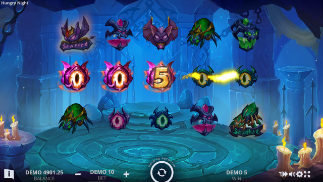Игровой автомат Hungry Night выдержан в вампирской тематике. Это отражено не только в дизайне, но и в символике. На барабанах крутятся летучие мыши, пауки, жуткие монстры и даже пылающие глаза. В игре Голодная Ночь задействовано 8 базовых символов и два Скаттера, запускающих фриспины. Все базовые элементы оплачиваются в соответствии с Таблицей. После неудачного спина может активироваться одно из двух случайных событий.